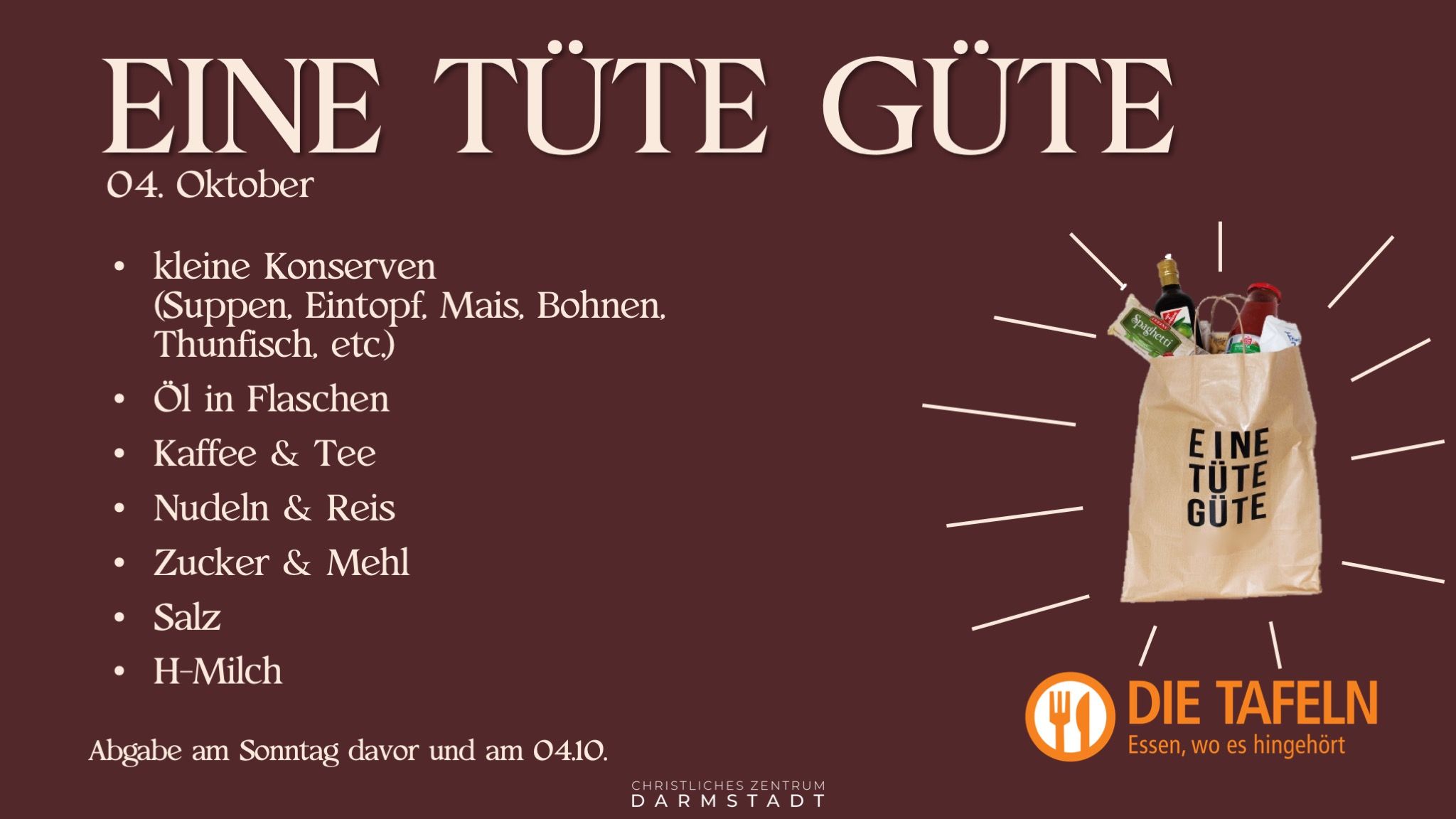 Als Kirche wollen wir einen Unterschied machen in unserer Gesellschaft. Dazu wollen wir die Darmstädter Tafel e.V. mit Lebensmittelspenden unterstützen und eine große Spenden an den Vorsitzenden überreichen, der anwesend sein wird. Ein Festgottesdienst bei dem wir die Großzügigkeit Gottes weitergeben möchten!